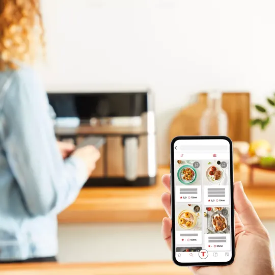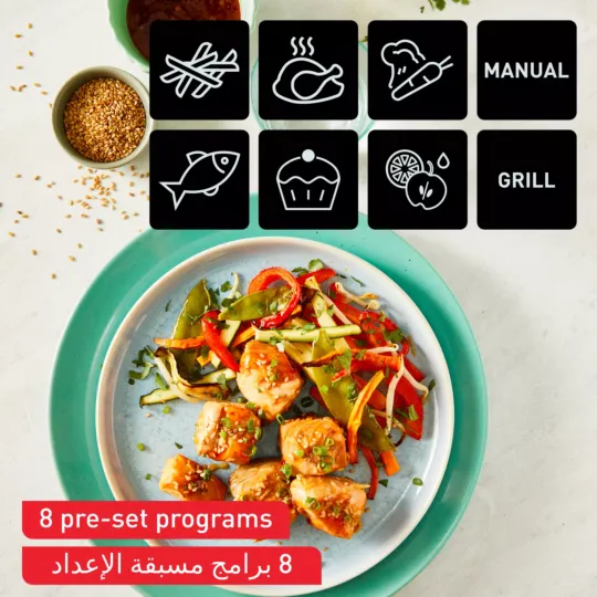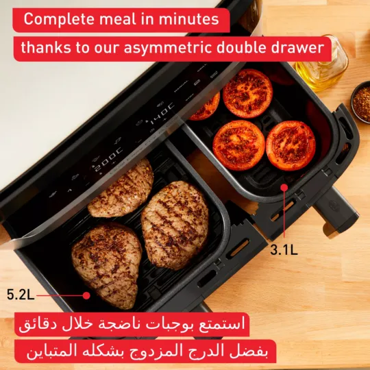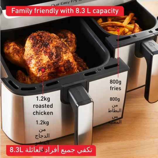 اكتشف القلاية الهوائية بدون زيت مزدوجة المهام بسعة 8.3L والتي تطهي وجبات منزلية متكاملة تكفي لكل أفراد العائلة في ذات الوقت تنفرد دوال إيزي فراي آند جريل من تيفال بدرجين لطهي صنفين مختلفين معًا— من اللحوم المشوية والبطاطس المقلية إلى السمك المقلي أو الخضراوات المشوية— والتي ستنضج في ذات الوقت. تمكنك برامجها الثمانية مسبقة الإعداد من الشواء والقلي دون زيت والتحمير والخبز وتحضير طعام مثيل بالطهي في الفرن دون الحاجة إلى المراقبة، في حين تجعل الأجزاء القابلة للغسل في غسالة الأطباق بأمان، التنظيف في غاية السهولة. وكل هذا يعني وقتًا أقل في المطبخ— يلائم الأيام الحافلة بالعمل دوال إيزي فراي آند جريل أسرع وموفّرة في الطاقة مقارنة بالطهي التقليدي في الفرن، كما تأتي مع تطبيق مجاني يغدق عليك بإلهام ووصفات سهلة لا حدود لها، لتتمتع بوجبات شهية تجهز خلال 15 دقيقة وأفكار صحية أكثر لتجربة تقنية القرمشة الإضافية المزوّد بها هذا الجهاز—كل ذلك وأكثر بين يديك!