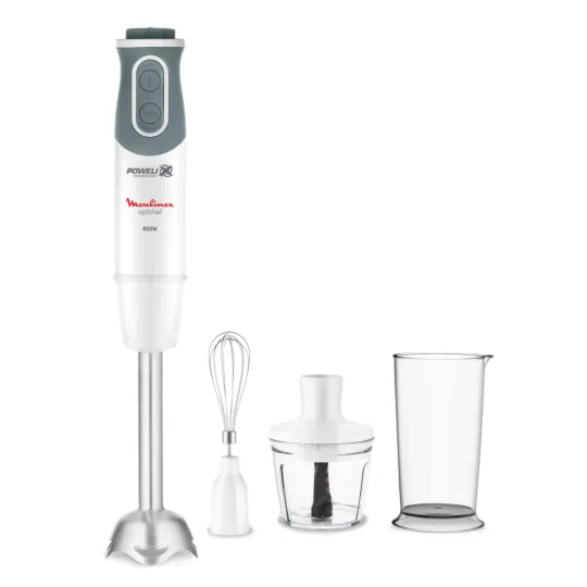 With the Optichef handblender by Moulinex, enjoy optimum power with none of the effort. Its exclusive Powelix Technology combined with a powerful 800W motor ensures high-performance blending and incredibly smooth results on even the hardest ingredients - time after time. Easily prepare a range of dishes and stay in total control with 20 non-stop adjustable speeds and an intuitive, easy-to-use dial. Plus, an anti-splash guard and non-slip handle provide total comfort of use, along with dishwasher-safe parts for easy clean-up.