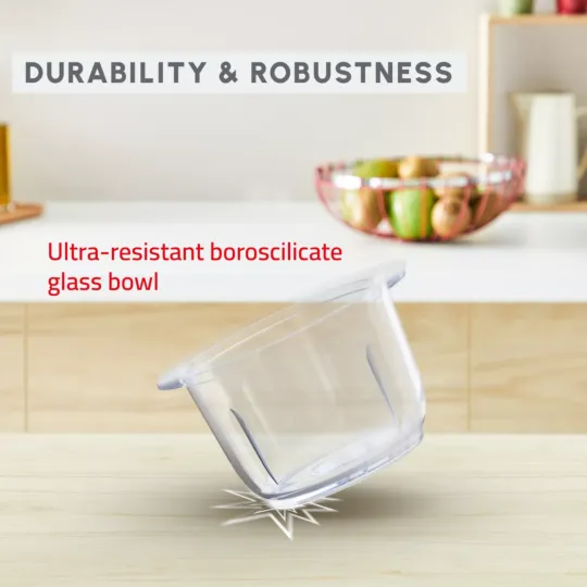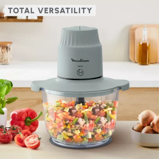 Discover the power of Choppeo, the glass bowl chopper that chops, mixes and minces with smoothness and precision! Made for everyday use with a durable borosilicate glass bowl and a generous 1 L useful capacity, it delivers quick results thanks to its 4 stainless steel blades, powerful motor, and two versatile speeds. This 3-in-1 appliance brings versatility to your culinary adventures and allows you to handle wide range of ingredients—including cheese, nuts, vegetables, herbs, meat and more!