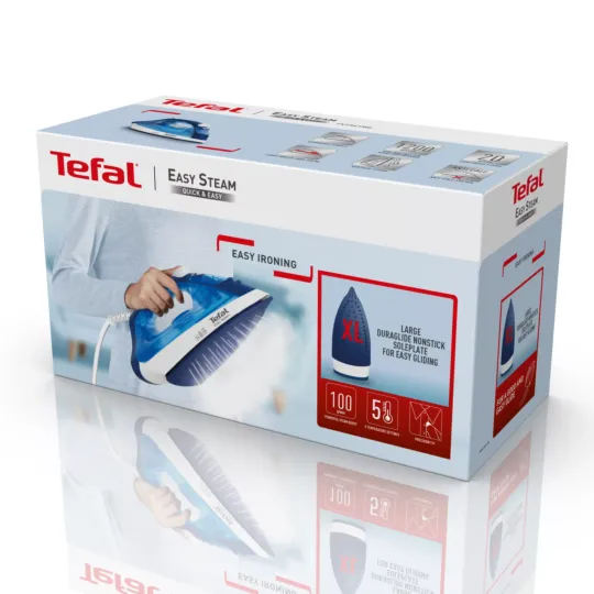 The TEFAL Easy Steam, Steam Iron is equipped with an XL Duraglide soleplate for an easier ironing experience with dependable glide and a large surface area for greater efficiency. The precision tip offers effortless access to hard-to-reach areas, while powerful steam and easy-to-use controls round off the perfect ironing package.