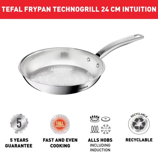 Smart features and performance that's built to last: The Tefal Intuition Frying Pan strikes the perfect balance between durability and modern convenience. With quality backed by a 5-year guarantee, this long-lasting 18/10 stainless steel frypan was designed to meet all your cooking needs day after day. Take your searing game to the next level, with mouth-watering results that come out crispy on the outside and extremely tender on the inside. The uncoated Techno-Grill surface offers the ideal texture for flawless searing and easy release—for everything from choice cuts of meat to shrimp scampi or grilled vegetables—while the thick heat-diffusion base and advanced induction technology ensure even cooking with total ease. The robust yet ergonomic no-gap handle promises a smooth and easy cooking experience with quality that stands the test of time.
