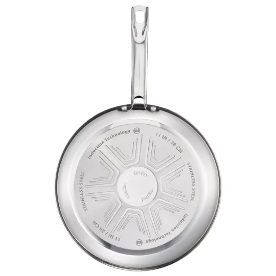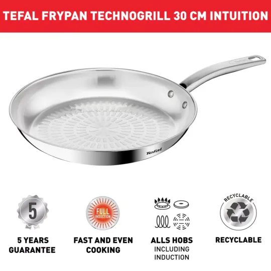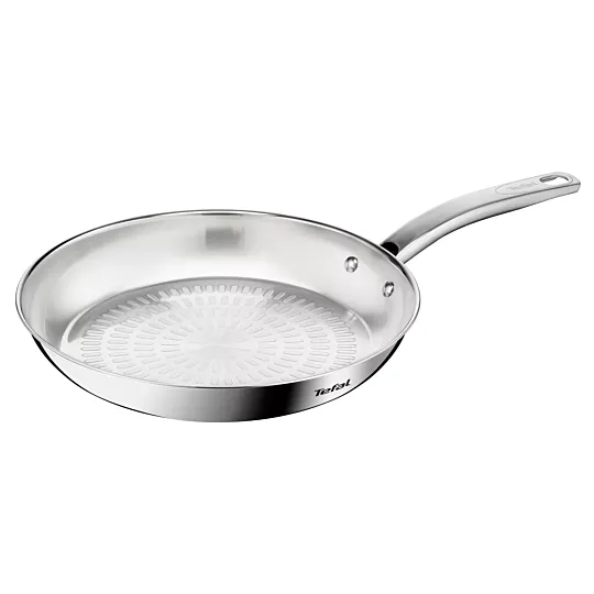 Smart features and performance that's built to last: The Tefal Intuition Frying Pan strikes the perfect balance between durability and modern convenience. With quality backed by a 5-year guarantee, this long-lasting 18/10 stainless steel frypan was designed to meet all your cooking needs day after day. Take your searing game to the next level, with mouth-watering results that come out crispy on the outside and extremely tender on the inside. The uncoated Techno-Grill surface offers the ideal texture for flawless searing and easy release—for everything from choice cuts of meat to shrimp scampi or grilled vegetables—while the thick heat-diffusion base and advanced induction technology ensure even cooking with total ease. The robust yet ergonomic no-gap handle promises a smooth and easy cooking experience with quality that stands the test of time.