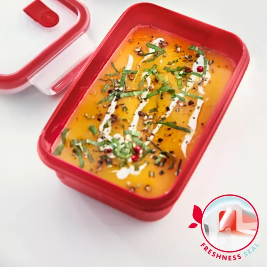 Discover a hygienic food storage solution that keeps food fresh for longer. With its 100% leak-proof, microwave-safe and frost-resistant design, it's perfect for conserving, transporting and reheating food with ease—all in the same container.