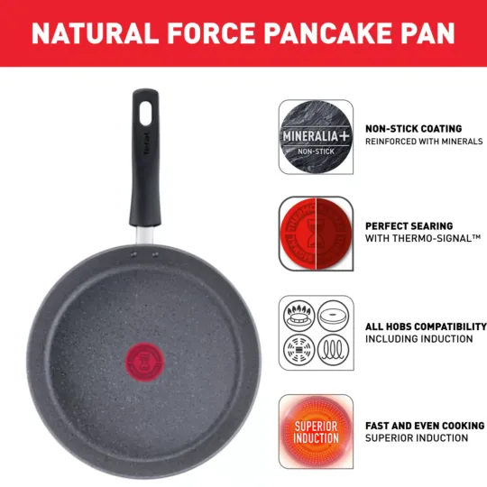 Discover the Tefal Natural Force Pancake Pan, part of the new must-have cookware collection for healthier cooking every day. Inspired by nature, Natural Force comes equipped with the new ultra-resistant Mineralia+ non-stick coating, combining minerals and impressive non-stick results, for low-fat cooking with performance that's built to last. On top its 100% recycled aluminum body* helps to reduce the environmental impact. Tefal’s latest innovations round off the package: Thermo-Signal™ for perfect searing and Thermo-Fusion+™ for fast and even cooking.