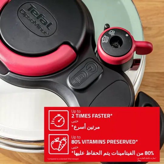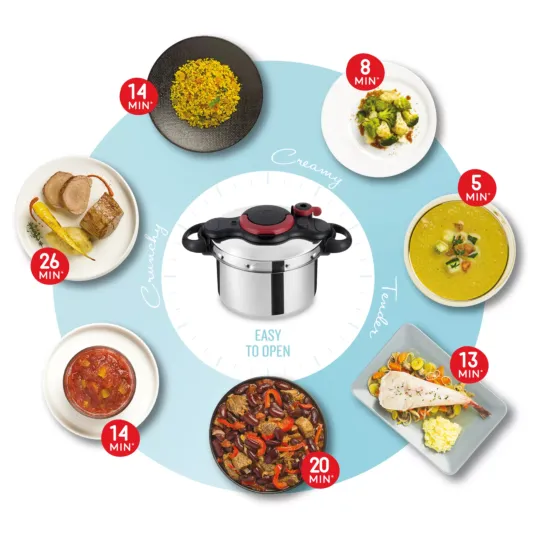 Prepare a wide array of dishes quickly and easily, with the ClipsoMinut'® Easy—the stainless steel pressure cooker that cooks up to two times faster*. Featuring a large enough capacity for the whole family and a light practical design, it's the perfect answer to fast, delicious meals!