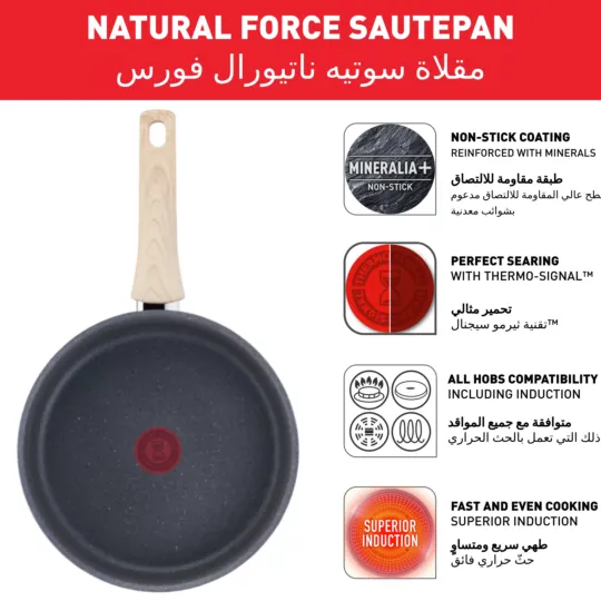 Discover the Tefal Natural Force Saute Pan, part of the new must-have cookware collection for healthier cooking every day. Inspired by nature, Natural Force comes equipped with the new ultra-resistant Mineralia+ non-stick coating, combining minerals and impressive non-stick results, for low-fat cooking with performance that's built to last. On top its 100% recycled aluminum body* helps to reduce the environmental impact. Tefal’s latest innovations round off the package: Thermo-Signal™ for perfect searing and Thermo-Fusion+™ for fast and even cooking.