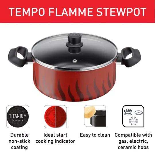 Tefal Tempo Flame is an easy-to-use stewpot designed to meet your everyday cooking needs. The new Thermo-Signal™ system lets you know the ideal temperature to start cooking, for perfect results with total ease, while the new easy-to-clean Titanium coating provides extra glide for longer for perfect results with total ease. Designed to make generous portions bursting with flavor, Tempo Flame is equipped with comfortable handles for an easy grip and a deep shape for meals hearty enough to satisfy the entire family. It's compatible with gas, electric and ceramic stovetops.