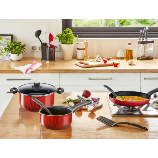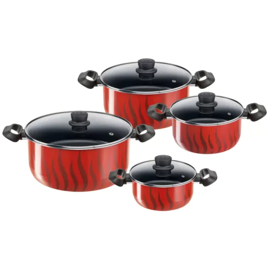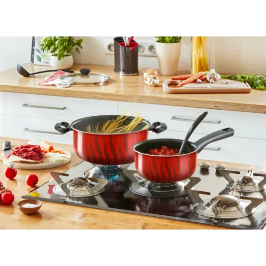 For easy, delicious cooking every day, non-stick pots Tefal Tempo Flame is an easy-to-use set designed to meet your everyday cooking needs. The new Thermo-Signal™ system lets you know the ideal temperature to start cooking, for perfect results with total ease, while a new easy-to-clean Titanium coating provides extra glide for longer. Designed to make generous portions bursting with flavor, Tempo Flame is equipped with comfortable handles for an easy grip and a deep shape for meals hearty enough to satisfy the entire family. It's compatible with gas, electric and ceramic stovetops.